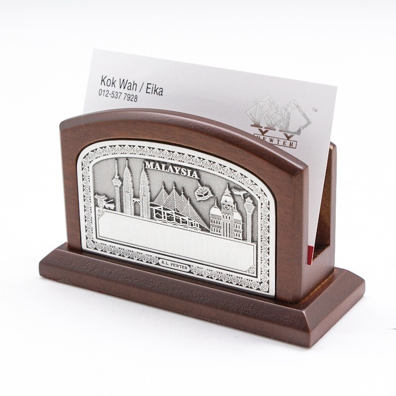 This beautiful wooden card holder makes an elegant choice as a desk accessory. The pewter plaque features well-known structures like the Kuala Lumpur Tower, Petronas Twin Towers, and other architectural gems.