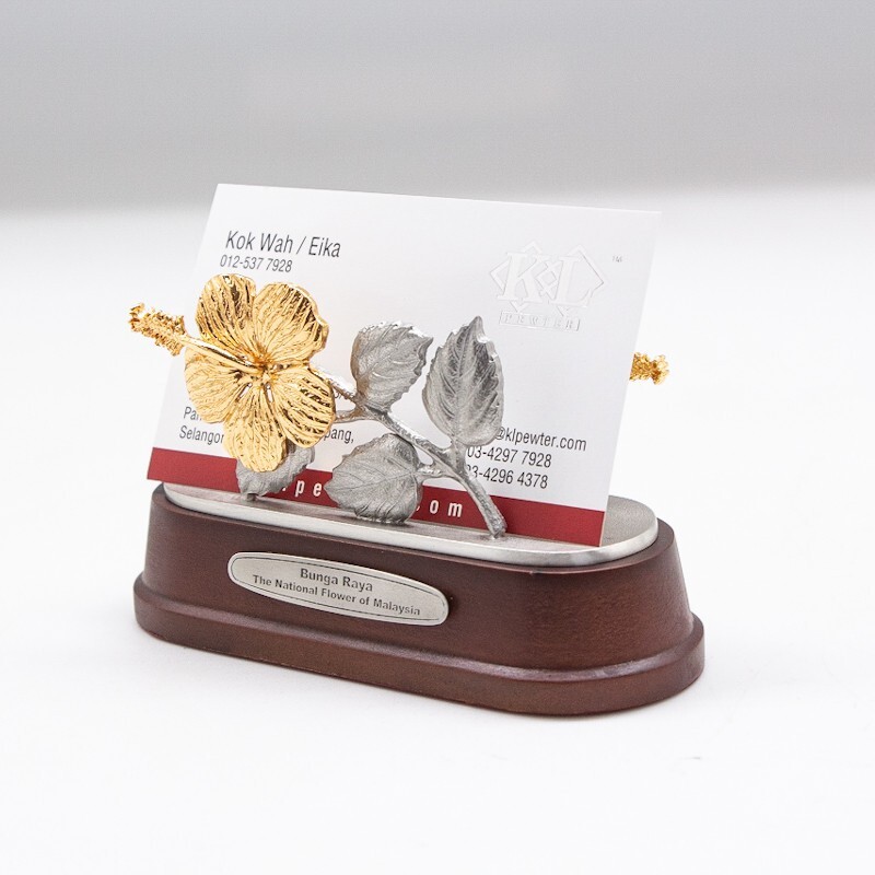 This beautiful pewter card holder with wood base makes an elegant choice as a desk accessory. Made from pewter and adorned with 24K gold plating, it intricately showcases Bunga Raya, the national flower of Malaysia.